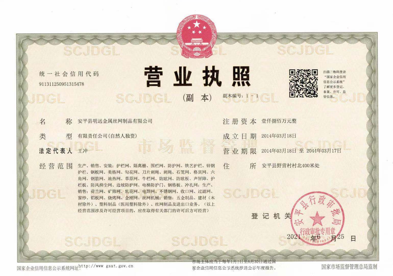 安平縣明遠(yuǎn)金屬絲網(wǎng)制品有限公司 -  座落于絲網(wǎng)產(chǎn)業(yè)基地河北安平,二十年絲網(wǎng)制作經(jīng)驗,是一家從拔絲、焊接、打砂、折彎、鍍鋅、噴塑、浸塑、為成品,生產(chǎn)研發(fā)安裝為一體的交通工程護(hù)欄網(wǎng)、光伏景區(qū)圍欄網(wǎng)專業(yè)型企業(yè)。明遠(yuǎn)公司擁有先進(jìn)的生產(chǎn)設(shè)備,全自動浸塑、噴塑、鍍鋅生產(chǎn)線,電腦焊網(wǎng)機(jī)組,聯(lián)合壓力機(jī),數(shù)控折彎機(jī),槍尖沖孔機(jī)等多臺輔助設(shè)備,具有大批量生產(chǎn)能力。